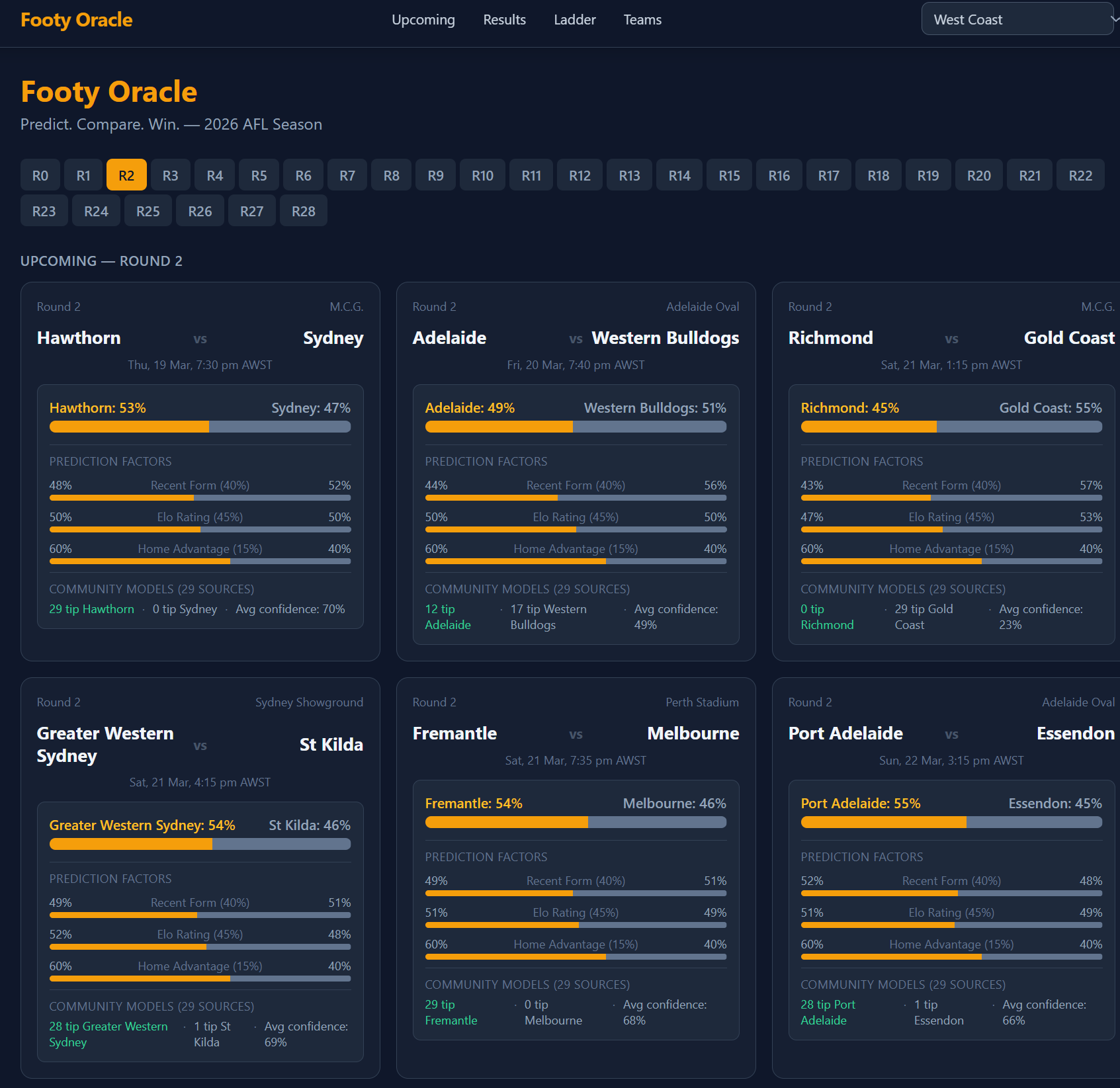 An AFL prediction platform for the 2026 season powered by a custom Elo rating model that achieved ~73.5% accuracy in 2025 backtesting. The model blends Elo ratings (45%), recent form over the last 8 games (40%), and home-ground advantage (15%), with community tips layered on top. Features live game predictions, team statistics, ladder standings, and historical results — all fetched server-side from the Squiggle API with tiered caching and zero database overhead. Built with Next.js 16, React 19, and Tailwind CSS v4.